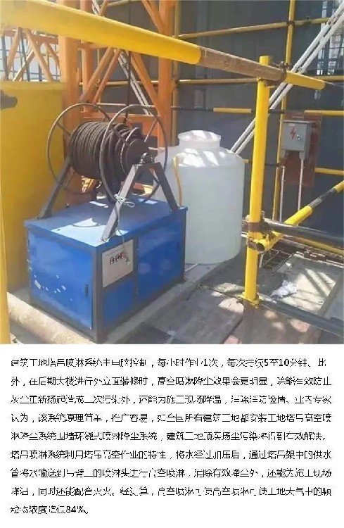 塔吊喷淋降尘系统是一种新型的降尘系统,其原理是利用高压泵将水加压,经高压管路送至高压喷嘴,形成飘飞的水雾。由于水雾颗粒是微米级的,非常细小,能够吸附空气中的杂质,营造良好清新的空气,达到降尘、加湿等作用。同时,水还具有清洗、降温等多用途,一举多得,使用经济。