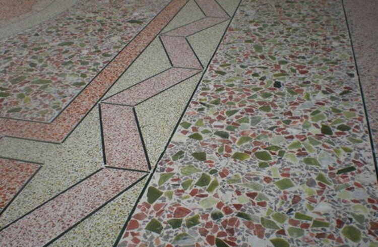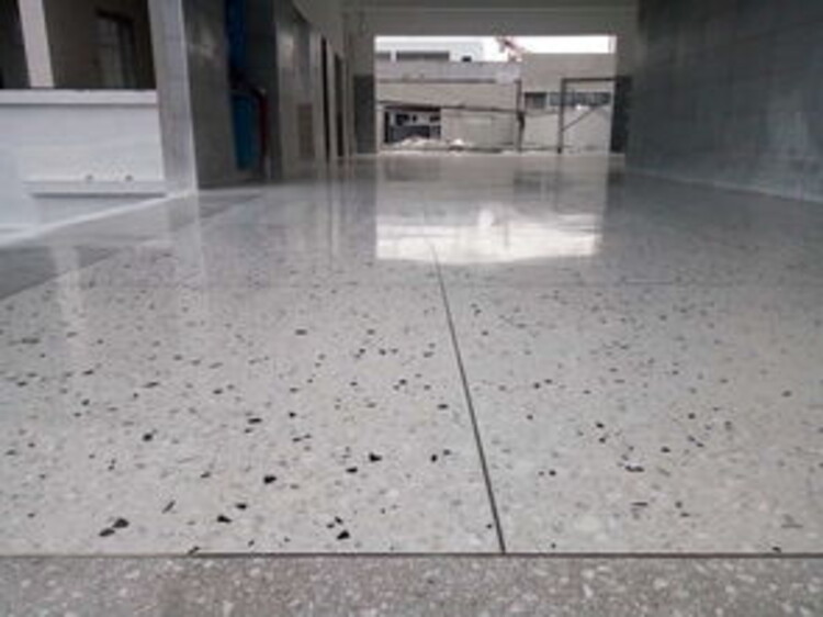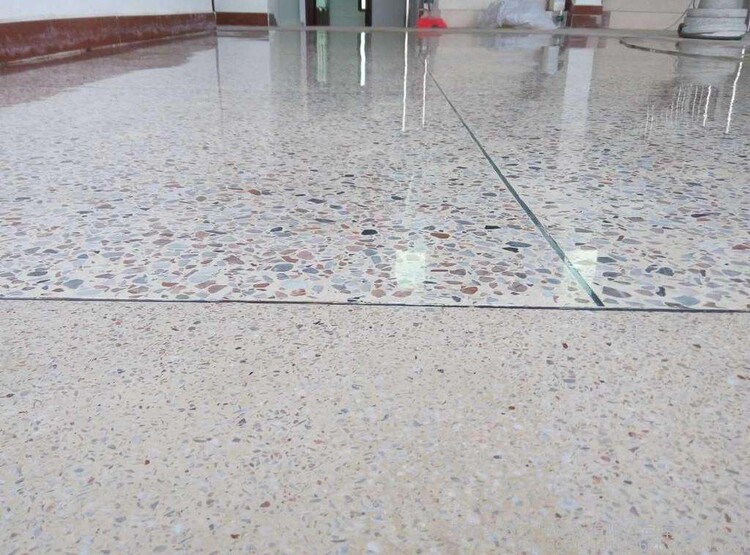 (3) 抹石子浆面层:刮一道素水泥浆,自下而上分两遍抹石子浆,抹面应比两侧已完成的地面略高1mm,后将石子浆层拍平、压实。