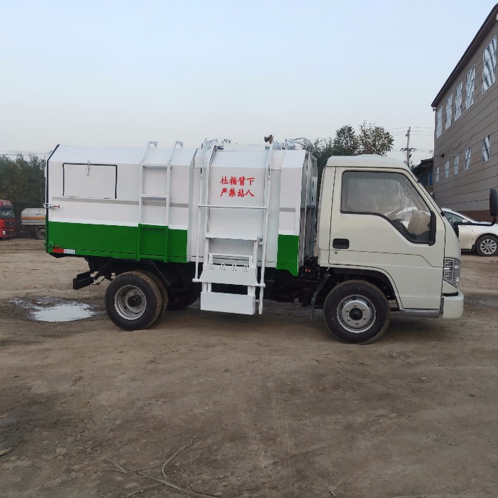1、胶条密封,液压式自卸整车垃圾。保证运输垃圾处于密闭状态。垃圾卸载时可一次性快速倾倒。右侧设有连杆滑块提升及自锁压桶机构, 120升、240升标准垃圾桶均可提升自翻至垃圾箱。