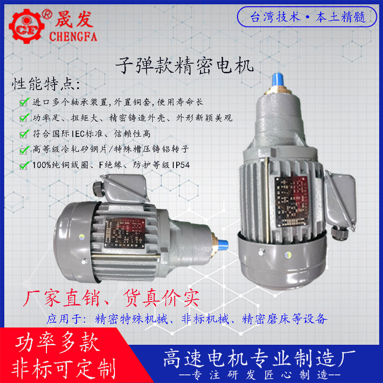 电机特性:1、高转速、无振动、无噪音;2、无风罩设计,不发热,寿命长;3、全纯铜线圈、矽钢片;4、整机动、静平衡已精心校队;5、采用国外内外径研磨机、精密磨床电机外形设计,整体机构紧凑,外形美观大方;