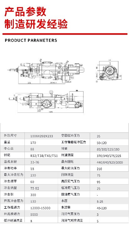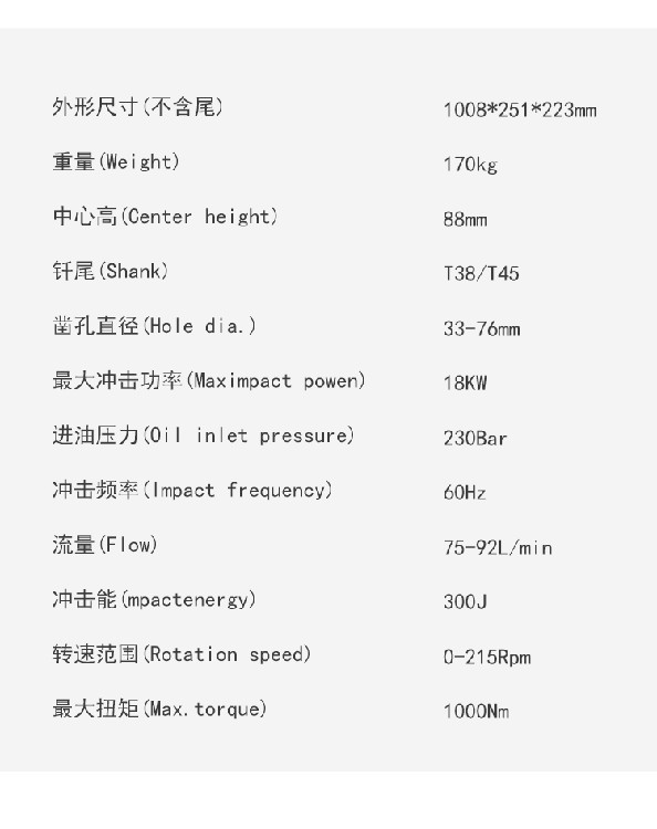 中⼼⾼88mm凿孔直径33-76mm外形尺⼨1008X292X233mm冲击功率18KW冲击频率60Hz流量75-92L/min重量170KG钎尾R32/T38/T45/T51/TC35(Φ52),R32/R38/T38/TC35/SR38(Φ38)冲击能300j