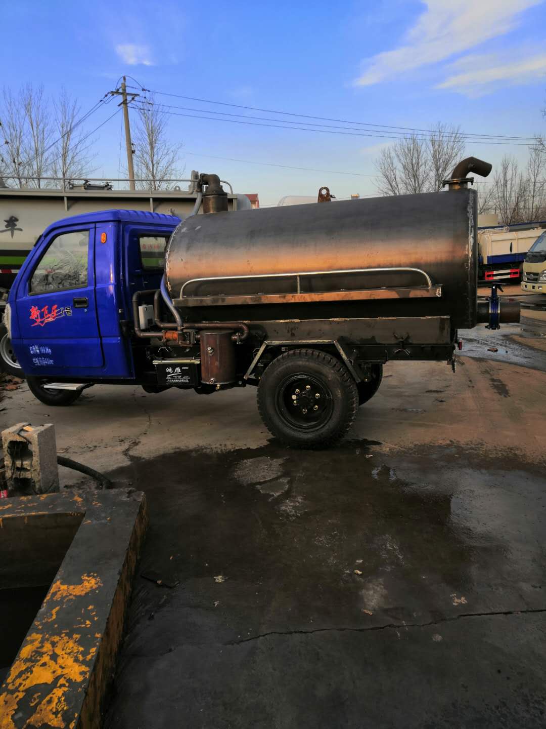 本公司生产的农机多功能三轮吸粪车,小巧灵活,低成本、低维护。适用于化粪池,养殖场,污水 池,厕所等污水粪便抽吸运输。