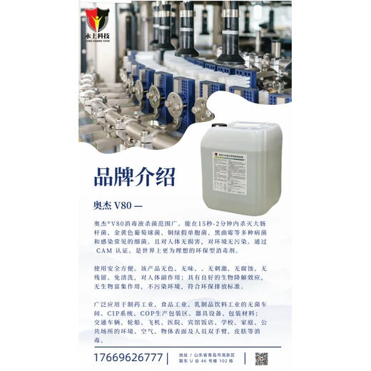 奥杰®IMUNELLV80易慕能消毒液是GMP环境、食品药品设备器具和包装灭菌消毒产品,由德国生化SCHMALZ博士研制发明,是德国食品药品管理局和农业部推荐产品,其广泛应用于制药工业、食品工业、乳制品饮料工业的无菌车间、CIP系统、COP生产包装区、器具设备、包装材料;交通车辆、轮船、飞机、医院、宾馆饭店、学校、家庭、公共场所的环境、空气、物体表面及人员双手臂、皮肤的消毒与公共卫生防疫消毒。